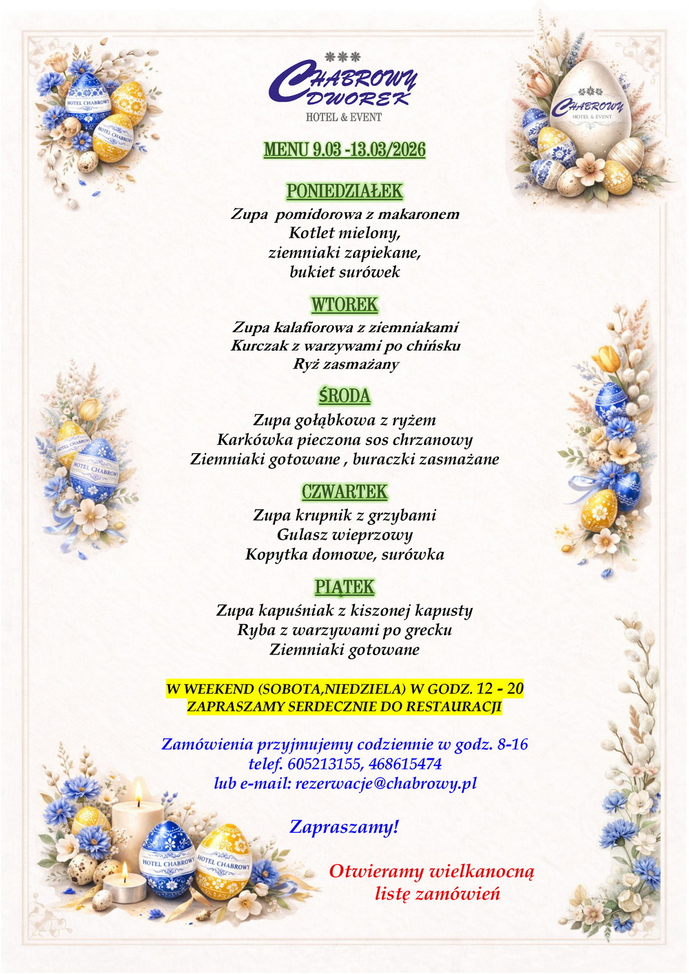 W weekend i święta proponujemy dania z Menu Restauracyjnego tylko odbiór osobisty.